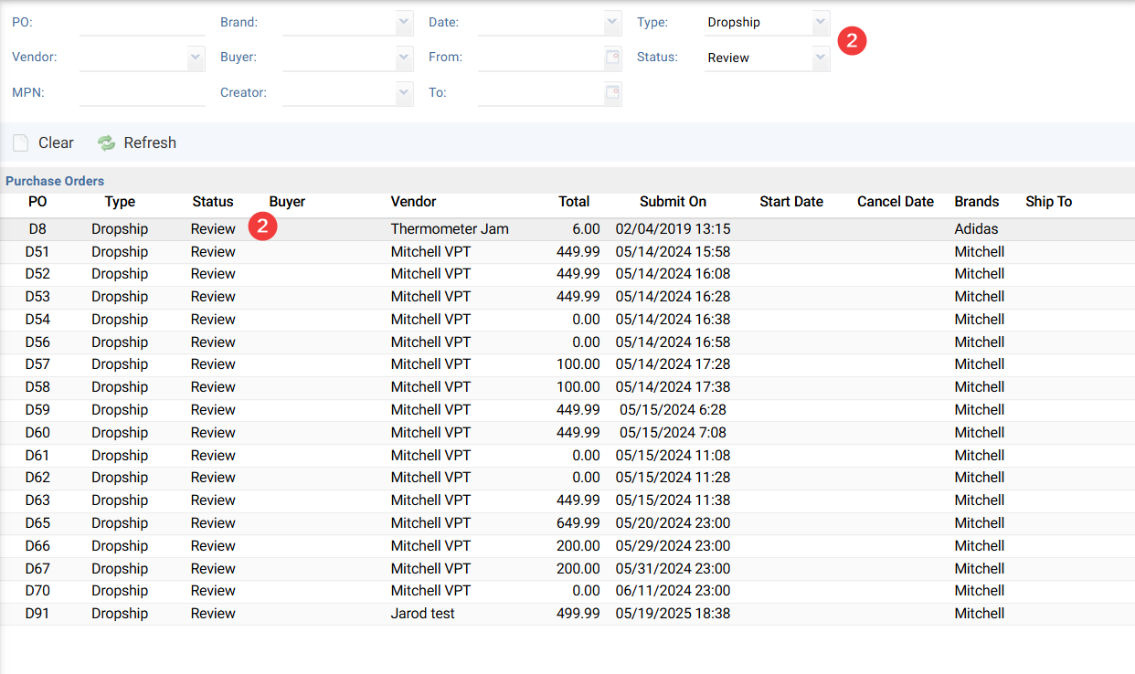 - Find and open the desired PO. If you’re unsure about the PO number, we recommend setting the Type to Dropship or JIT and the Status to Open, Ready, or Review.