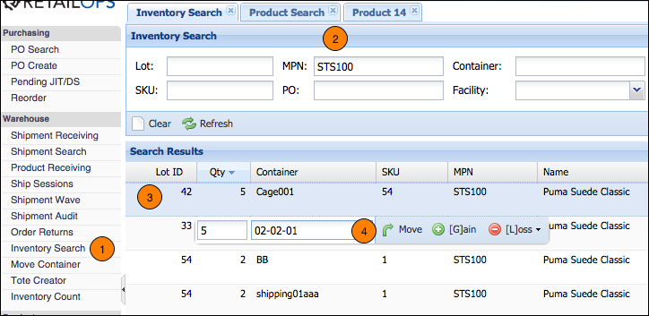 - On the web app, go to Warehouse > Inventory Search.