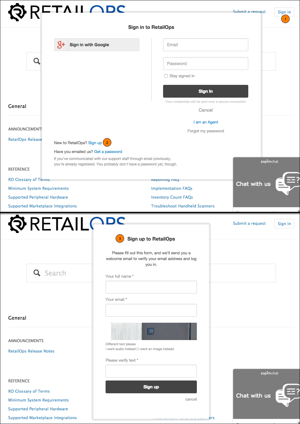 Create New Support Accounts Quan Vu July 18, 2023 22:05 Updated Follow Go to the RetailOps Help Center. In the top-right corner, press the [Sign in] button. In the Sign-in window, press the Sign up link in the bottom-left. Fill out the sign-up form with your name and email then press the [Sign up] button. Related articles View Submitted Ticket Requests Contact Us Create New User Accounts RetailOps 2.11.7 Release Notes Comments 0 comments Please sign in to leave a comment.