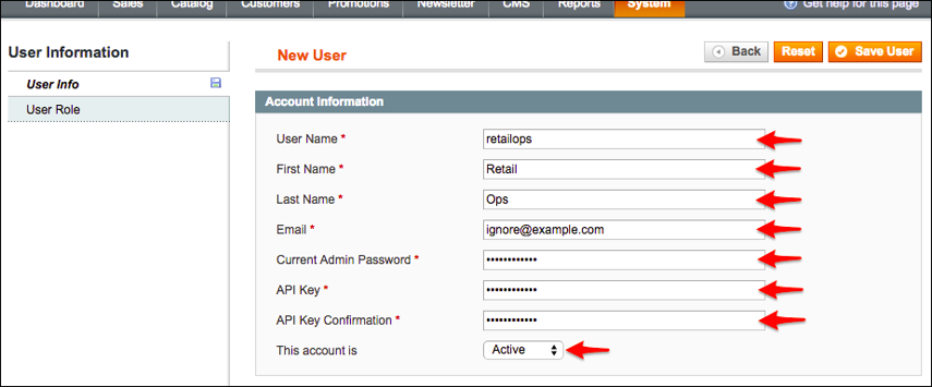 7. Under the User Info tab, fill in the required info. For User Name and API Key, enter the values provided in the RetailOps Channel Setup tab for the desired channel.