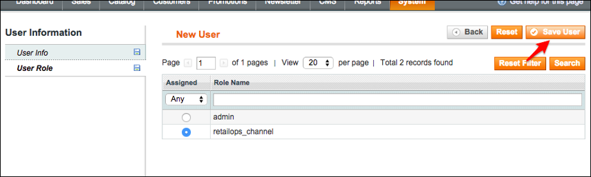 8. Switch to the User Role tab. Select the Role you created earlier (during Steps 2-4). Press the [Save User] button.