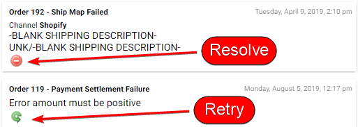 You may resolve/retry individual system alerts either from the System Alerts view or from the event log of the appropriate RO tool (e.g. if there’s a system alert for a customer order, you may resolve the alert from the Order Detail screen). If you look below, you can resolve the same alert from either screen.