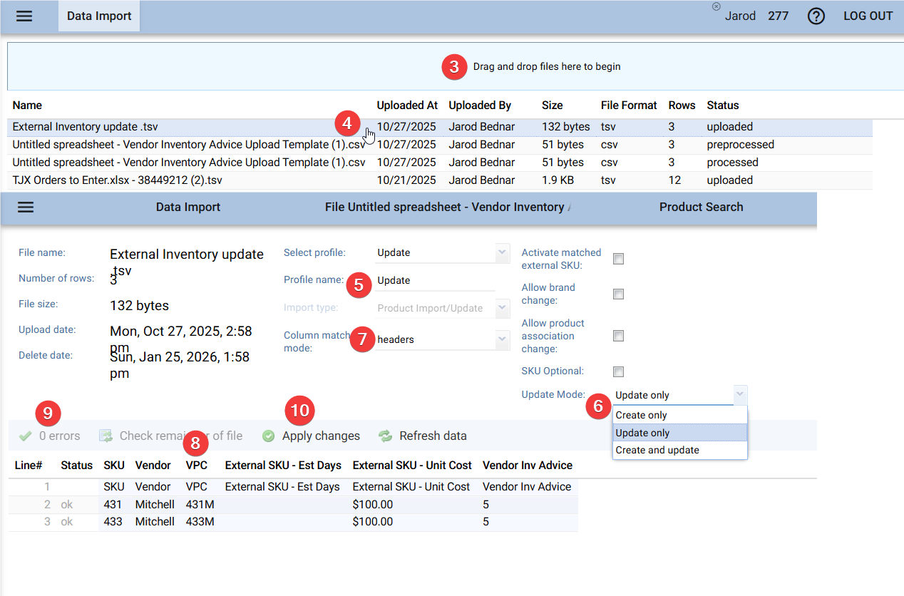 To upload new or updated data for your External SKUs, like new vendor external inventory, you can do it manually in the PIM [See article here for details] or with a bulk file in the Data import tool.